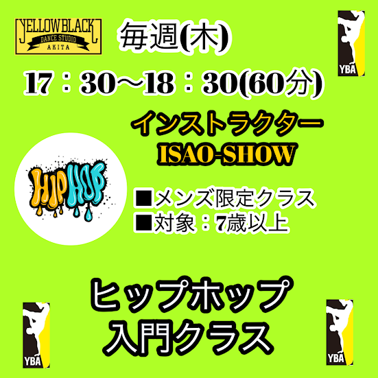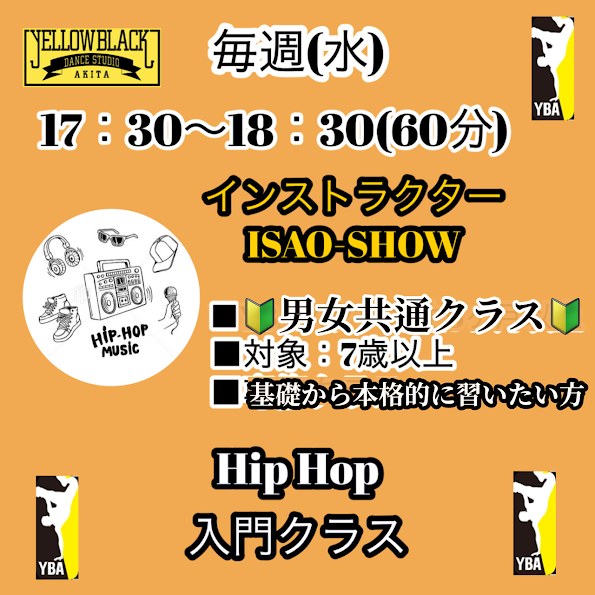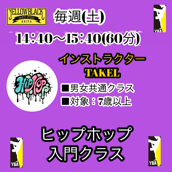 *待望クラス* 毎週土 14:40〜15:40(60分)「ヒップホップ入門クラス」〜男女共通クラス *お待たせいたしました!平日 通えない方はこちらのクラスがオススメです |